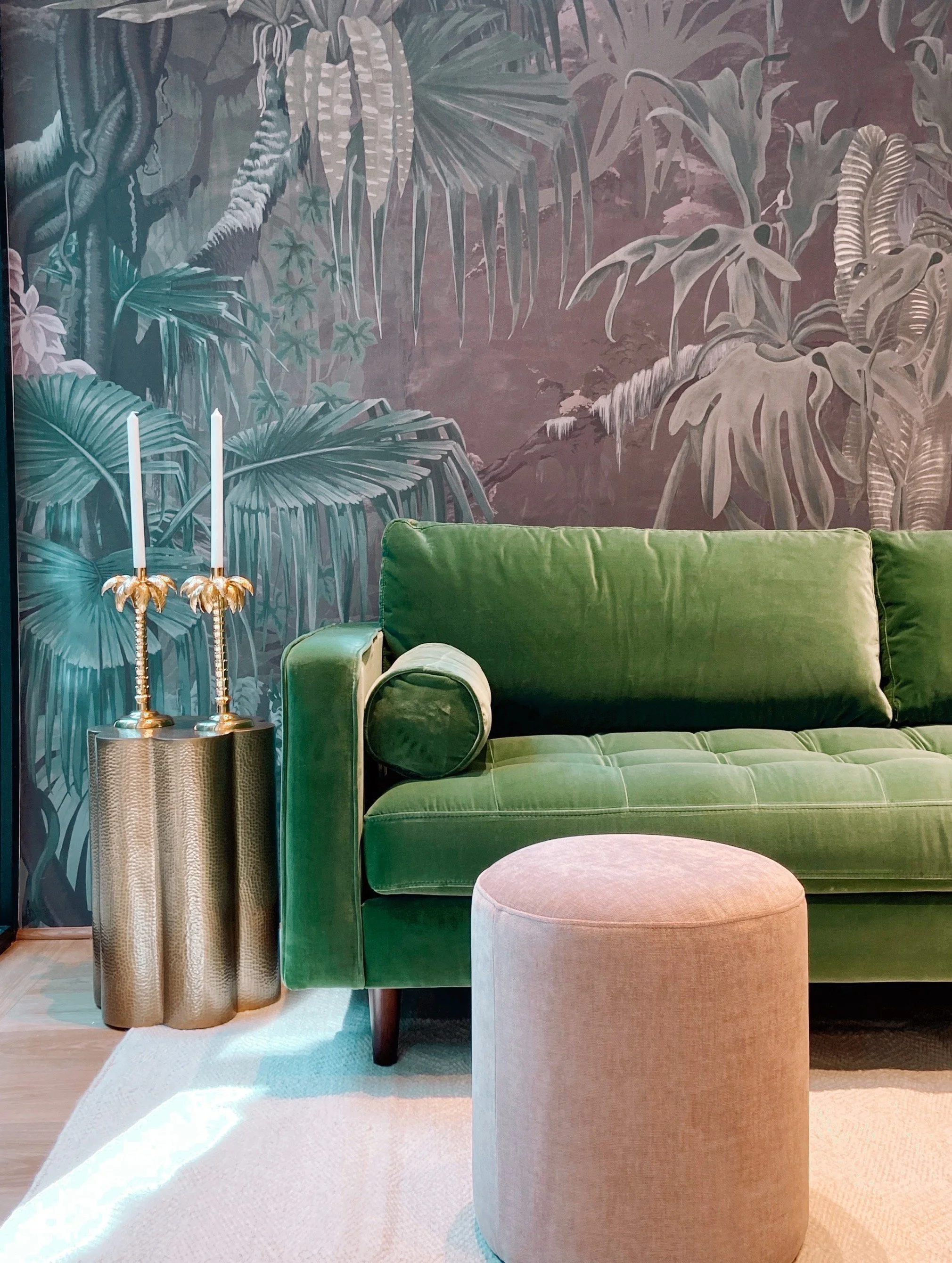 Hear jungle wallpaper and think childish and tacky? This subtle tropical wallpaper helps blend this beautiful living room into the outdoors and paired with the solid green couch is the perfect combo.